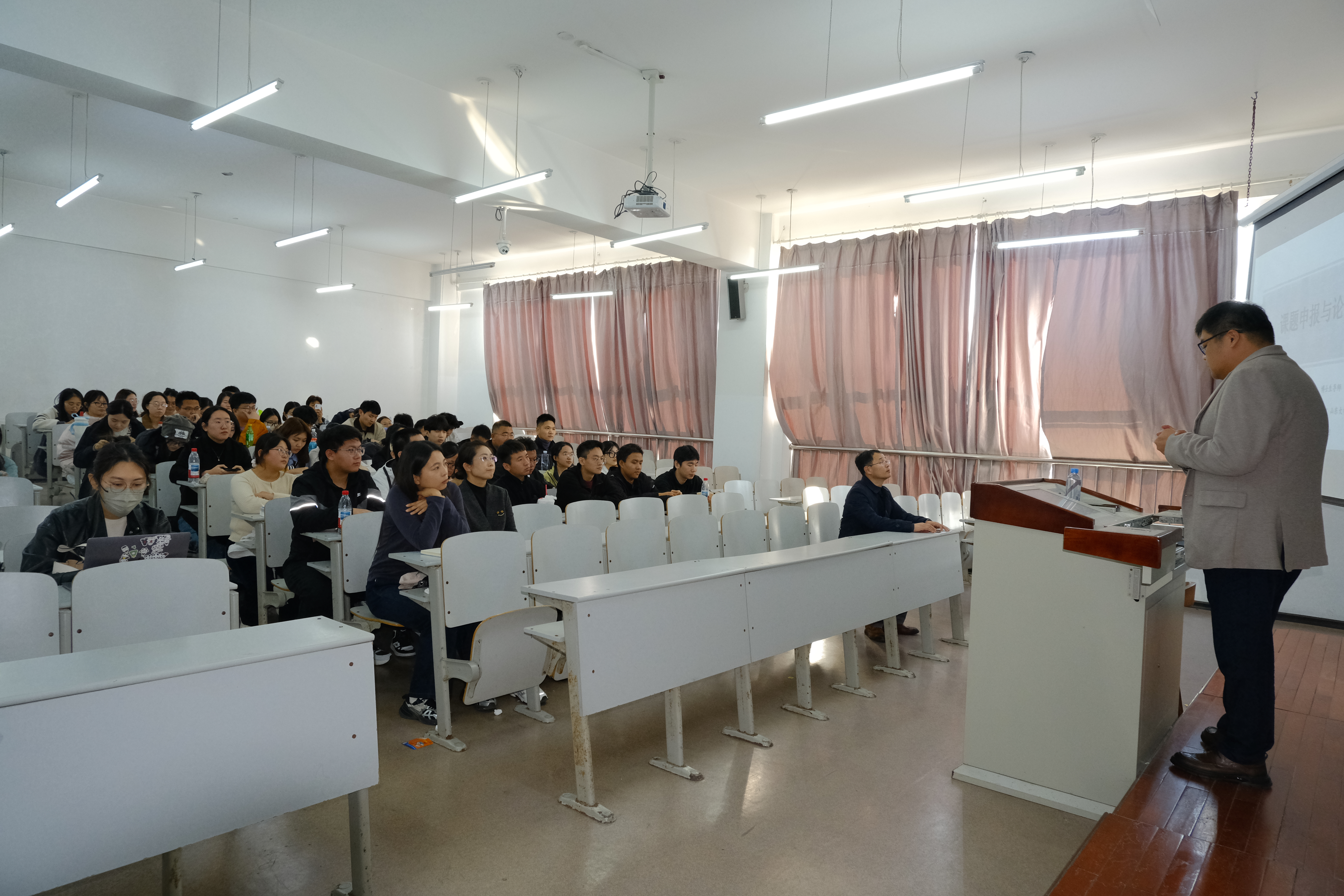 讲座中,蒋鹏副教授结合自身多年的学术研究与指导经验,从课题申报与高水平论文写作两大核心板块展开讲解。针对课题申报,他系统梳理了选题与政策导向契合度、论证逻辑严谨性、申报材料打磨等核心要素,强调学术研究需兼顾创新性与实用性;在SSCI、SCI论文写作部分,他聚焦文献综述、研究方法选择、逻辑框架构建等重点内容,通过典型案例剖析常见问题,并分享了论文投稿与返修回复的实用策略。现场学术氛围浓厚,师生们专注聆听并认真记录。